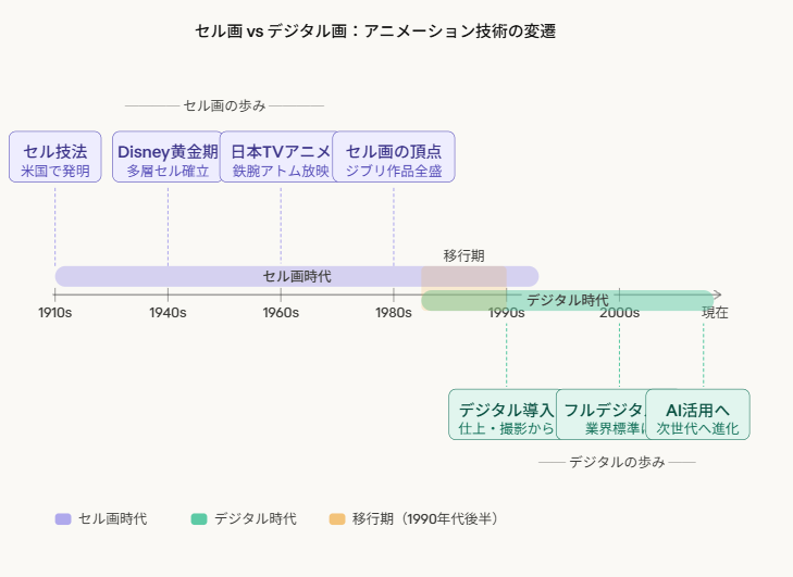 日本では1997年から2002年の5年間に、セル画からデジタル彩色へと急速に移行しました。移行が進んだ理由は複数あります。