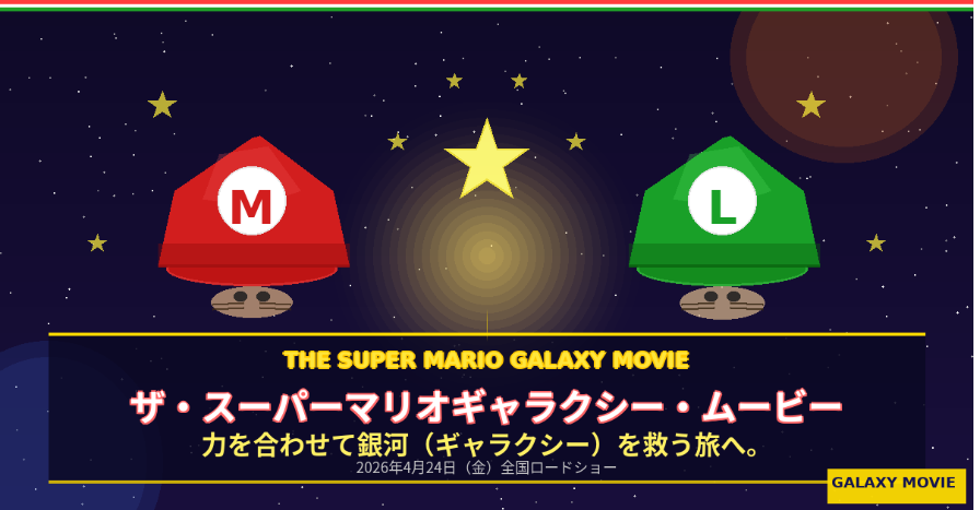 タイトル: ザ・スーパーマリオギャラクシー・ムービー 原題: The Super Mario Galaxy Movie 日本公開日: 2026年4月24日(金)全国ロードショー 上映時間: 99分 監督: アーロン・ホーヴァス & マイケル・ジェレニック(前作と同じコンビ) 脚本: マシュー・フォーゲル(同上) 音楽: ブライアン・タイラー(同上) 製作: クリス・メレダンドリ(イルミネーション)、宮本茂(任天堂) 配給: 東宝東和(日本)/ ユニバーサル・ピクチャーズ(全世界) 公式サイト: https://mario-movie.jp/