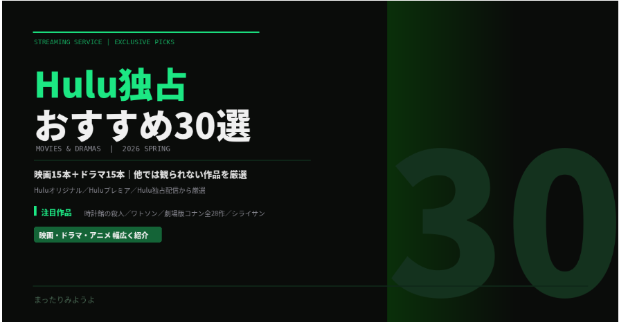 今回はHuluの独占配信・限定配信からおすすめ作品を30本選びました。映画15本+ドラマ15本で、ジャンルもミステリー、アクション、ホラー、韓国ドラマ、アニメと幅広くカバーしています。